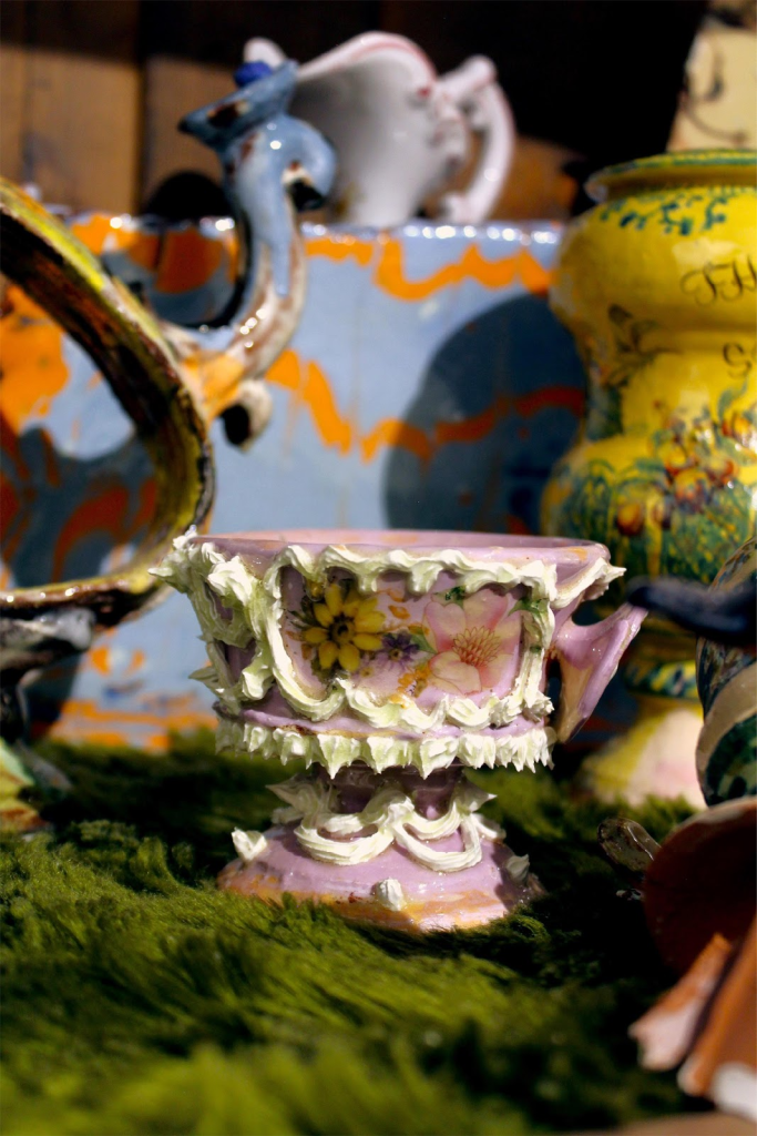 Grâce aux techniques mixtes et références éclectiques, aux recherches, à l’inventaire, et à la composition, je forme d’étranges objets kitsch.